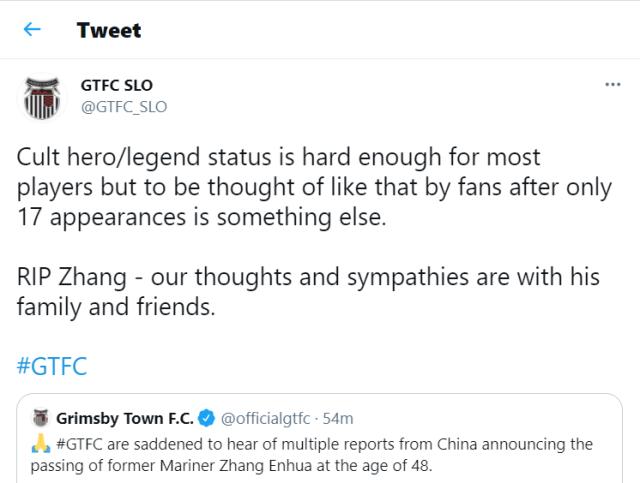 通过官方社交媒体,格林斯比表达了对昔日阵中大将的哀悼:“我们通过来自中国的消息,得知了48岁的前‘水手’(格林斯比绰号)张恩华去世的消息。这名前中国国脚在2000年12月加盟球队,代表格林斯比出战17场。安息吧,张。”效力格林斯比期间,张恩华帮助球队完成了保级目标,还曾有3球入账。而他在与伯恩利一战中打进的头球,还在2001-02赛季被当地的电视节目《Goals on Sunday》选为片头。